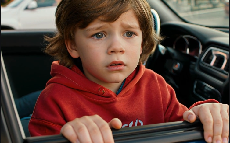 Dirty. Barefoot. Hair stuck to his forehead like he’d been rained on and then forgotten. His shirt was too big, sliding off one shoulder. His knees were scraped raw. And his eyes—those huge, dark eyes—looked straight at my window with the kind of hunger that isn’t only about food.